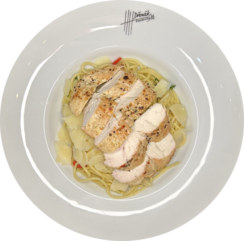 Špagety aglio-olio s grilovaným kuřecím masem a parmazánem